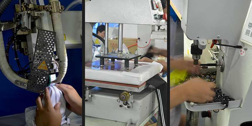 專業(yè)設備200條臺,包括重機電腦平車、刀車、 鐳射切割機、壓膠機、無鏠熱壓機、驗針機、釘扣機、套結機、鎖邊機、刀切機、鎖眼機、測水壓機等等。