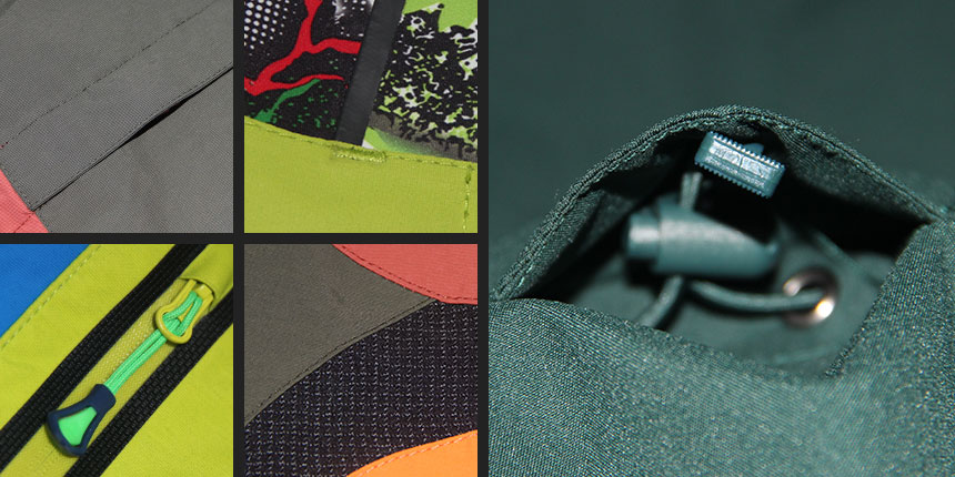 肩部、肘部加耐磨層;內中下部有防風腳,以防止風從下擺灌入衣內;腋下可配透氣拉鏈,在出汗較多的情況下可直接拉開透氣;內置式帽子,以便在不用的時候可以收起。不同款式的配色設計、及特殊細節(jié)處理:如在袖口處有小掛扣,等等。